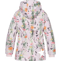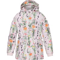 Carole is a functional parka jacket in a feminine shape. It is pink with a floral print. Carole has a detachable hood, a front zip, front pockets and grey rib at the sleeves. It has Molo's iconic star reflector on one shoulder. This product has a water resistant, PFC-free surface treatment (Does not contain, e.g. PFOS, PFOA, etc). Water column pressure: 5.000 mm. breathable: 5.000 g/m2/24hr