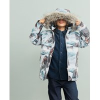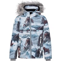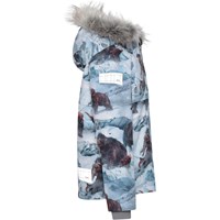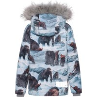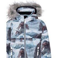Castor is a lined and waterproof winter jacket in light blue with a print of mammoths. The jacket has a detachable hood, a hidden zipper with a placket, hidden pockets, visible reflectors on the sides of the sleeves and on the back. The jacket is made in a windproof, waterproof and breathable fabric, while the lining and the interlining are recycled and made of recycled polyester. This product has a water resistant, PFC-free surface treatment (Does not contain, e.g. PFOS, PFOA, etc). Water column pressure: 15.000 mm. breathable: 15.000 g/m2/24hr. They have straps with velcro for braces that can be purchased.