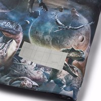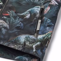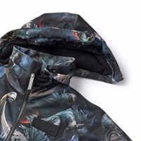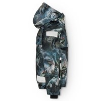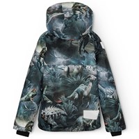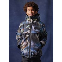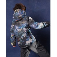 Wind- and waterproof winter jacket in recycled polyester for a cold winter with a print of dinosaurs in space in blue, green, and brown shades. The jacket has a detachable lined hood and a zipper with flap to keep out snow, wind, and water. The jacket has several large reflectors to increase visibility in traffic. The jacket has lined zip pockets as well as an adjustable elastic at the bottom of the jacket to keep the warmth in and the wind out. The sleeves have ribbed cuffs, which effectively keep out wind, snow, and rain while ensuring that gloves stay in place. The jacket is lined with 3M™ Thinsulate™, which provides the child with greater mobility.