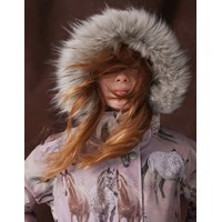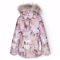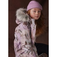 Wind- and waterproof winter jacket in recycled polyester for a cold winter with a print of horses on a dreamy background in pink and purple shades. The jacket has a detachable lined hood with a removable faux fur collar and a zipper with a flap that keeps snow, wind, and water out. There is also a large reflector on the back to increase visibility in traffic. The jacket has lined front pockets and an adjustable elastic waistband, providing shape and snugness around the body. The sleeves have ribbed cuffs, that effectively keeps wind, snow, and rain out while ensuring that gloves stay in place. The jacket is lined with 3M™ Thinsulate™, which provides greater mobility for the child.