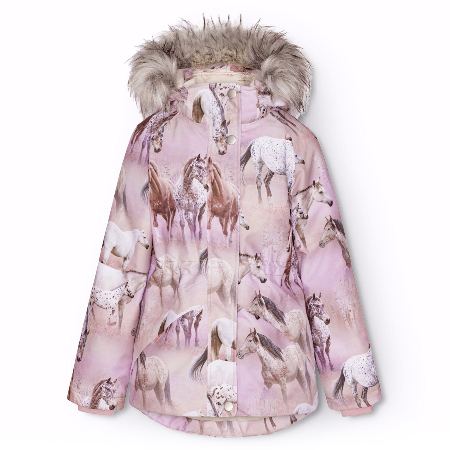 Wind- and waterproof winter jacket in recycled polyester for a cold winter with a print of horses on a dreamy background in pink and purple shades. The jacket has a detachable lined hood with a removable faux fur collar and a zipper with a flap that keeps snow, wind, and water out. There is also a large reflector on the back to increase visibility in traffic. The jacket has lined front pockets and an adjustable elastic waistband, providing shape and snugness around the body. The sleeves have ribbed cuffs, that effectively keeps wind, snow, and rain out while ensuring that gloves stay in place. The jacket is lined with 3M™ Thinsulate™, which provides greater mobility for the child.
