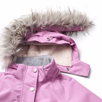 Purple wind and waterproof winter jacket in recycled nylon. The jacket has a detachable lined hood with faux fur collar, zipper with flap, lined zip pockets, snow guard in the sleeves, and an adjustable elastic at the waist for a snug fit around the body and effectively keeps the wind out. The jacket is equipped with a large reflector on the back, ensuring visibility in traffic. Furthermore, the jacket is lined with fleece and padded with 3M™ Thinsulate™.