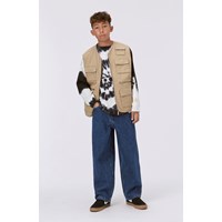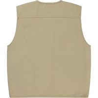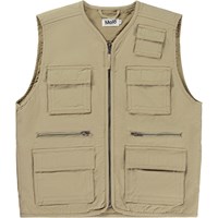 Cool, beige vest with a zip closure and various pockets on the outside of the front. The vest is in 100% cotton.