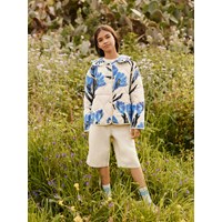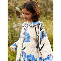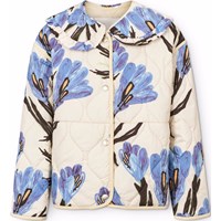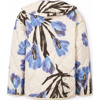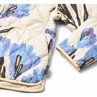Off-white wind and water-repellent padded jacket made of soft cotton with a wavy quilted pattern, matching trim and large, hand-drawn floral print in blue and purple shades. The jacket has snap buttons at the front and a sewn-on collar with fine ruffle details. A light and warm jacket with an elegant and colourful expression.