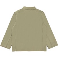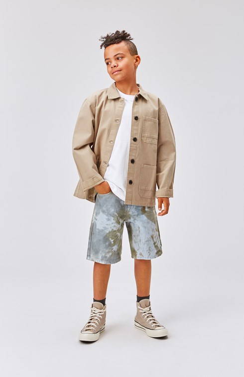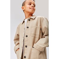 Halley is a beige cotton jacket with a collar and patch pockets on the front. The jacket has a button closure on the front.