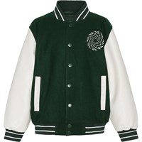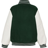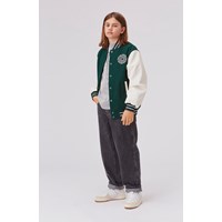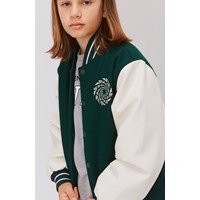 Hani is a baseball jacket in dark green with white sleeves. The jacket has a button front closure and striped rib at the neck, sleeves and bottom. It has 'Good vibes' printed on the chest.