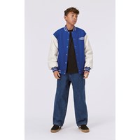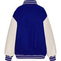 Baseball jacket in blue with white sleeves and ''one world'' embroidered on the chest. The jacket has a button front closure and rib at the neck, sleeves and bottom.