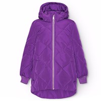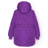 Water-repellent purple quilted jacket in recycled polyester, with padded filling. The jacket is knee-length and has a detachable hood, a standing collar, a zip with a chin guard at the front, and side pockets. it has ribbed cuffs that seal out snow, rain, and wind. The jacket's water-repellent surface is free from PFOS and PFOA.