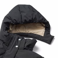 Wind and water-repellent black winter jacket in recycled polyester. The jacket has a detachable lined hood, practical zipper with flap, as well as waterproof zipper pockets. There is a pocket on the sleeve for a ski pass and an interior pocket for extra storage. The jacket has a wind flap at the waist and sleeve openings with thumb holes, which effectively keep out snow, wind, and water. Inside, the jacket is lined with recycled polyester fill, 3M™ Thinsulate™, which helps retain heat.
