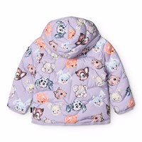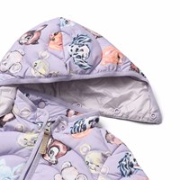 Purple water-repellent quilted jacket for the little ones made of recycled polyester with purple lining, purple edges and a print of colorful animals from old cartoons. The jacket has a detachable hood, a stand-up collar, a zipper with chin guard, and a single front pocket. Furthermore, the jacket has a recycled polyester filling that provides even softness and optimal thermal insulation and the water-repellent surface is free of PFOS and PFOA.
