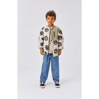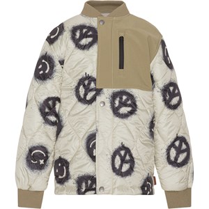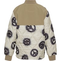 Harold is a beige quilted jacket with a peace sign print. It has rib edges at the neck and sleeves as well as a zip closure. The jacket is also water-repellent and PFC-free.