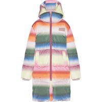 Harper is a warm, long coat in a pastel coloured rainbow print. The jacket has a hood, zip pockets on the front and reflectors on the back. Harper is lined with technical down, called pearl padding, which makes it extra soft, retains heat and has a down-like feel. This product has a water-resistant, PFC-free surface treatment (Does not contain, e.g. PFOS, PFOA, etc). Water column pressure: 5.000 mm. Breathable: 5.000 g/m2/24hr.