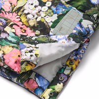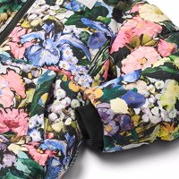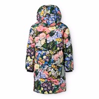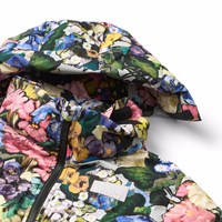 Wind and water-repellent floral jacket in recycled polyester with practical zip closure, high collar, and detachable hood. The jacket has a length above the knee and is designed with front pockets, an inner pocket, and ribbed cuffs. High slits with snap buttons on both sides ensure great freedom of movement and make the jacket practical for cycling. A large reflector on the back increases visibility in traffic. The jacket is lined with soft, recycled polyester filling for even comfort and optimal warmth insulation.