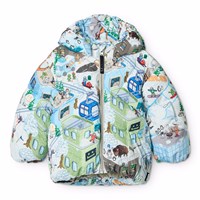 Water-repellent dark blue jacket for the little ones made of recycled nylon. The jacket has a detachable hood, a front zipper, lined pockets, as well as elastic around the wrists and bottom to keep the heat in. Additionally, the jacket has a recycled polyester filling that provides consistent softness and optimal thermal insulation and the water-repellent surface is free of PFOS and PFOA.