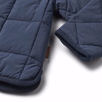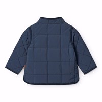 Dark blue water-repellent thermal jacket in recycled nylon with quilted pattern. The jacket has a regular fit, side pockets, button closure on the front, and matching edge tape, which gives a nice finish.