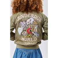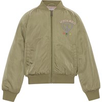 Hatty is a green bomber jacket with a lovely embroidery of various animals on the back with the text ´Wonderous World´. The jacket has rib at the neck, bottom and sleeves.