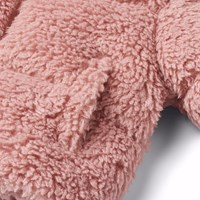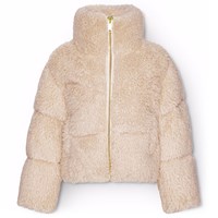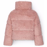 Quilted pink faux fur jacket in shearling look. The jacket has a stand-up collar, front pockets, and a zip closure.