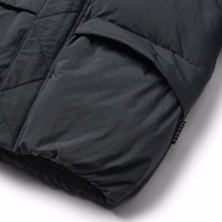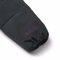 Black water-repellent jacket made of recycled nylon. The jacket has a detachable hood and a zipper with a flap that keeps out snow, wind, and rain. It has front pockets as well as elastic cuffs to help keep the wind out. The jacket is lined with recycled polyester filling, providing even softness and optimal thermal insulation. Features: Wind and water-resistant. Water column pressure: 5,000mm. Breathability: 3,000 g/m2/24h. PFC-free (PFOS and PFOA).