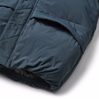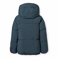Blue water-repellent jacket made of recycled nylon. The jacket has a detachable hood and a zipper with a flap that keeps out snow, wind, and rain. It has front pockets as well as elastic cuffs to help keep the wind out. The jacket is lined with recycled polyester filling, providing even softness and optimal thermal insulation. Features: Wind and water-resistant. Water column pressure: 5,000mm. Breathability: 3,000 g/m2/24h. PFC-free (PFOS and PFOA).