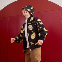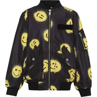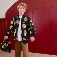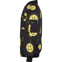 Heath is a black bomber jacket with yellow spray painted smiling faces. Heath has black rib at the neck, sleeves and waist, and it has pockets with snaps and an extra zip pocket on the left arm.