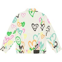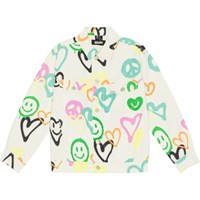 White denim jacket in a colourful, all over print of graffiti spray painted hearts, peace signs and smiling faces. The jacket has a classic, straight collar, a button front closure and pockets on the chest and at the sides. There is an elastic at the back hip to create an oversized look. Sizes 92-134 have a practical, snap closure, that looks like buttons, so small children have an easier time closing the jacket. Sizes 140-176 have a traditional button closure.