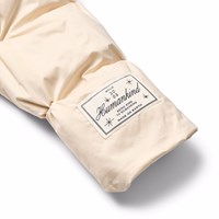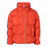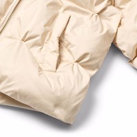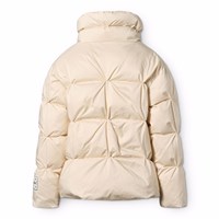 Water-repellent off-white jacket made of recycled polyester with a puffer effect. The jacket has a front zip, a stand-up collar, side pockets, and is lined with recycled polyester filling, providing smooth softness and optimal thermal insulation. The jacket's water-repellent surface is free from PFOS and PFOA.