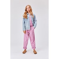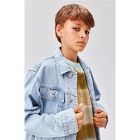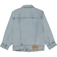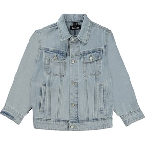 Heni is a light blue denim jacket in a light wash. Heni has two chest pockets with buttons and side pockets. There is a brown leather Molo logo patch on the bottom left side of the back.