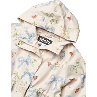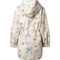 Off-white wind- and waterproof jacket made from recycled polyester with a soft, matte finish and an eye-catching print of butterflies and flowers shaped like bows. The jacket has a detachable hood, zip with protective flap, adjustable Velcro around the wrists, large front pockets with flaps, and adjustable elastic at the waist for a better fit. A functional and stylish model for changing weather.
