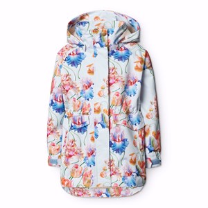 Light blue wind- and waterproof jacket in recycled polyester with a colourful print of artistic tulips. The jacket features a detachable hood, side pockets with pocket flap details, a wind flap at the zipper, and elastic and adjustable velcro at the cuffs to effectively keep the wind out. Inside, it has an adjustable elastic at the waist to adjust the jacket's silhouette and fit.