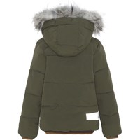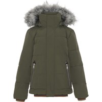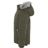 Herbert is a green winter jacket with a detachable hood with a detachable faux fur trim. It has a covered front zip closure and storm flaps at the sleeves and bottom. The jacket is lined in technical down, called pearl padding, which makes it extra soft, retains heat and has a down-like feel. This product has a water-resistant, PFC-free surface treatment (Does not contain, e.g. PFOS, PFOA, etc). Water column pressure: 10.000 mm. Breathable: 8.000 g/m2/24hr.
