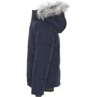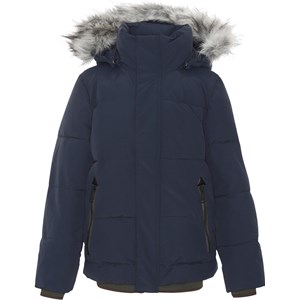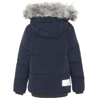 Herbert is a dark blue winter jacket with a detachable hood with a detachable faux fur trim. It has a covered front zip closure and storm flaps at the sleeves and bottom. The jacket is lined in technical down, called pearl padding, which makes it extra soft, retains heat and has a down-like feel. This product has a water-resistant, PFC-free surface treatment (Does not contain, e.g. PFOS, PFOA, etc). Water column pressure: 10.000 mm. Breathable: 8.000 g/m2/24hr.