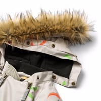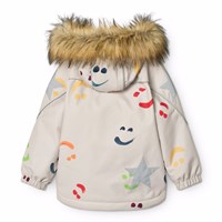 Beige wind and waterproof winter jacket made of recycled polyester with a print of colorful smiling faces. The jacket has a detachable lined hood with a detachable faux fur trim, two zippers on the front with an inside flap, and a ribbed chin guard to prevent skin from getting caught. The jacket has reflective tape on the sleeves, back, and hood, as well as two reflective stars, to ensure the visibility in traffic. The sleeves have an elastic cuff that keeps the wind, snow and rain out and keeps the gloves in place. Additionally, the jacket is lined with recycled polyester fleece, 3M™ Thinsulate™, which helps to keep the heat.