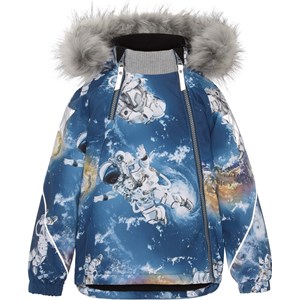 Hopla Fur is a functional and waterproof winter jacket in blue with an astronaut print. Hopla Fur is perfect for extremely cold days but also ordinary winter days. The high level of breathability helps regulate a child's body temperature so it does not become too cold or over heated. On warmer winter days, a child can wear the jacket with a thin under layer, but on extremely cold days, you can add an extra layer underneath. Hopla Fur is also a good choice for less active moments.The jacket has a detachable hood with a faux fur edge (also detachable), slanted front zip closure, rib at the neck, elastic at the sleeves and Molo's iconic star reflectors on the upper sleeves and the bottom on the back. The jacket also has high quality fleece in vulnerable places, and it has taped seams. The outer fabric is made from 45% recycled polyester, the 3M™ Thinsulate™ padding from 78% recycled polyester and the lining from 100% recycled polyester. This product has a water resistant, PFC-free surface treatment (Does not contain, e.g. PFOS, PFOA, etc). Water column pressure: 15.000 mm. Breathable: 15.000 g/m2/24hr.