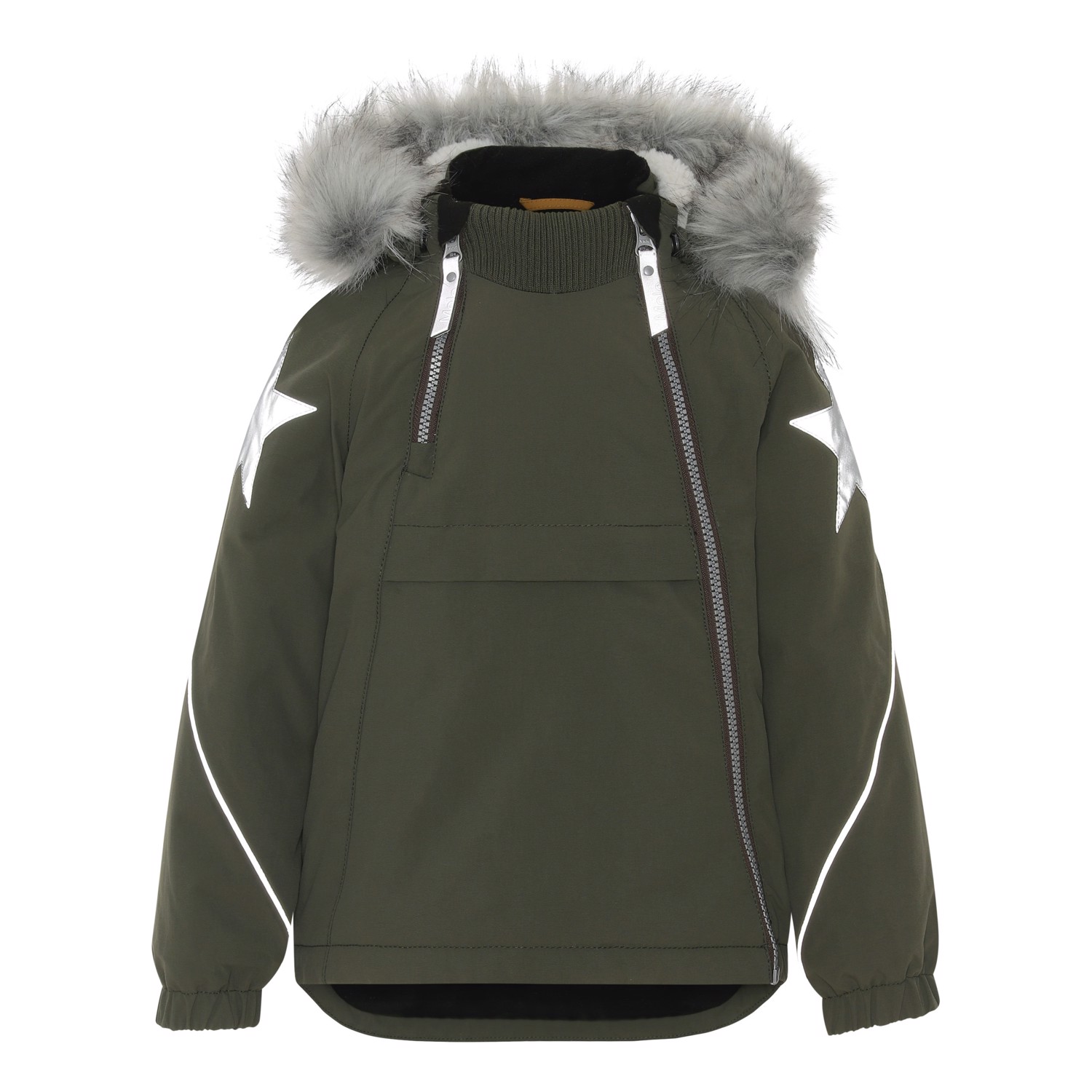 Hopla Fur is a functional, waterproof winter jacket in green. Hopla Fur is perfect for extremely cold days but also ordinary winter days. The high level of breathability helps regulate a child's body temperature so it does not become too cold or over heated. On warmer winter days, a child can wear the jacket with a thin under layer, but on extremely cold days, you can add an extra layer underneath. Hopla Fur is also a good choice for less active moments.The jacket has a detachable hood with a faux fur edge (also detachable), slanted front zip closure, rib at the neck, elastic at the sleeves and Molo's iconic star reflectors on the upper sleeves and the bottom on the back. The jacket also has high quality fleece in vulnerable places, and it has taped seams. The outer fabric is made from 59% recycled nylon, the 3M™ Thinsulate™ padding from 78% recycled polyester and the lining from 100% recycled polyester. This product has a water resistant, PFC-free surface treatment (Does not contain, e.g. PFOS, PFOA, etc). Water column pressure: 15.000 mm. Breathable: 15.000 g/m2/24hr.