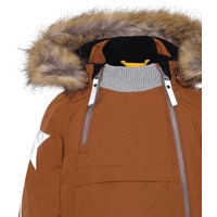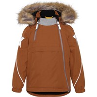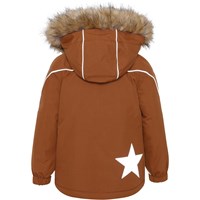 Hopla Fur is a functional and waterproof winter jacket in brown. The jacket's lining and interlining are recycled and made from recycled polyester. It has a detachable hood with a detachable faux fur edge, slanted zippers on the front, rib at the neck, elastic at the sleeves and Molo's iconic star reflectors on both upper sleeves and at the bottom of the back. The jacket also has high quality fleece at vulnerable spots and it has taped seams. This product has a water resistant, PFC-free surface treatment (Does not contain, e.g. PFOS, PFOA, etc). Water column pressure: 15.000 mm. breathable: 15.000 g/m2/24hr. They have straps with velcro for braces that can be purchased.