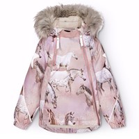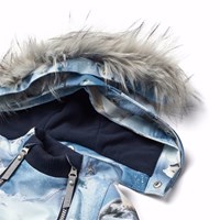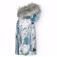 Wind- and waterproof winter jacket in recycled polyester for a cold winterwith a print of playful polar bears among ice floes in shades of blue. The jacket has a detachable lined hood with a removable faux fur trim and two zippers on the front with chin guard to prevent skin from getting caught. The zippers have internal storm flaps, which help keep snow, wind, and water out. The jacket has reflectors on the sleeves, back, and hood, as well as two star reflectors on the sleeves, to increase visibility in traffic. The sleeves have an elastic edge that effectively keeps wind, snow, and rain out while ensuring that the gloves stay in place. The jacket is lined with fleece and 3M™ Thinsulate™, which provides the child with greater mobility due to its lightweight.