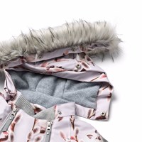 Purple wind and waterproof winter jacket made of recycled polyester with a print of beautiful willow branches and white kitten. The jacket has a detachable lined hood with a detachable faux fur trim, two zippers on the front with an inside flap, and a ribbed chin guard to prevent skin from getting caught. The jacket has reflective tape on the sleeves, back, and hood, as well as two reflective stars, to ensure the visibility in traffic. The sleeves have an elastic cuff that keeps the wind, snow and rain out and keeps the gloves in place. Additionally, the jacket is lined with recycled polyester fleece, 3M™ Thinsulate™, which helps to keep the heat.