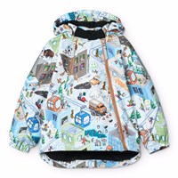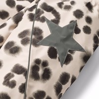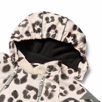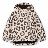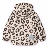 Wind and waterproof winter jacket made of recycled polyester with a unique leopard print. The jacket has a detachable, a lined hood, two zippers on the front with internal flaps, and a ribbed edge as a chin guard to prevent the skin from getting caught. The jacket has reflective bands on the sleeves, back, and hood, as well as two reflective stars to ensure visibility in traffic. The sleeves have an elastic cuff that keeps wind, snow, and rain out and keeps the gloves in place. Additionally, the jacket is lined with recycled polyester fleece, 3M™ Thinsulate™, which helps to keep the heat.
