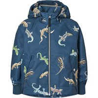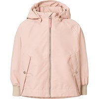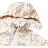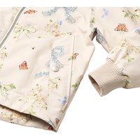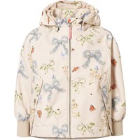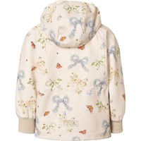 Off-white jacket made from recycled polyester that protects against wind and water. The jacket has a colourful print of butterflies and flowers shaped like bows. Furthermore, the jacket has a detachable hood, pockets, zip with chin guard, and wide ribbed cuffs at the wrists. The waist can be adjusted internally for a good fit.