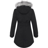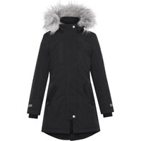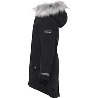Peace is a functional, waterproof parka jacket in black. It has a detachable hood with a detachable faux fur trim, reflector, hidden zipper with a placket, sleeve opening with storm flap, three front pockets and elastic at the back for a more fitted shape. The jacket is made in a windproof, waterproof and breathable fabric with taped seams. The jacket's outer fabric is 51% recycled, while the lining and interlining are made of recycled polyester. This product has a water resistant, PFC-free surface treatment (Does not contain, e.g. PFOS, PFOA, etc). Water column pressure: 15.000 mm. breathable: 15.000 g/m2/24hr. They have straps with velcro for braces that can be purchased.