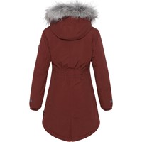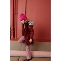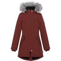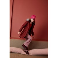Peace is a functional, waterproof parka jacket in dark red. It has a detachable hood with a detachable faux fur trim, reflector, hidden zipper with a placket, sleeve opening with storm flap, three front pockets and elastic at the back for a more fitted shape. The jacket is made in a windproof, waterproof and breathable fabric with taped seams. The jacket's outer fabric is 51% recycled, while the lining and interlining are made of recycled polyester. This product has a water resistant, PFC-free surface treatment (Does not contain, e.g. PFOS, PFOA, etc). Water column pressure: 15.000 mm. breathable: 15.000 g/m2/24hr. They have straps with velcro for braces that can be purchased.