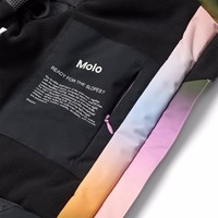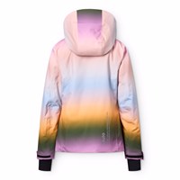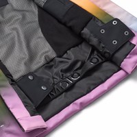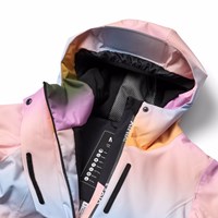 Wind and waterproof rainbow-colored winter jacket made of recycled polyester. The jacket has a lined hood, a front zipper with flap, as well as waterproof zipper pockets. There is a pocket on the sleeve for a ski pass and an interior pocket for extra storage. The jacket has a wind flap around the waist, velcro around the wrists, and sleeve openings with thumb holes, which keep the snow, wind, and water out. Furthermore, the jacket is lined with fleece, padded with 3M™ Thinsulate™, and a text reflector to be visibel in traffic.