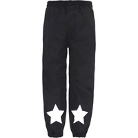 Haven is a pair of lightweight, functional rain trousers in black. The trousers have an elastic leg opening and Molo's iconic star reflector on one leg. They can be used in all sorts of weather because the fabric is water resistant and breathable. This product has a water resistant, PFC-free surface treatment (Does not contain, e.g. PFOS, PFOA, etc). Water column pressure: 5.000 mm. breathable: 5.000 g/m2/24hr.