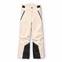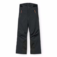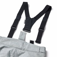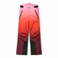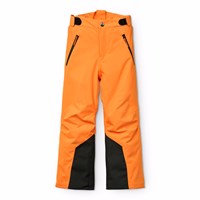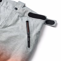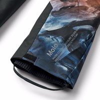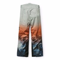 Wind and waterproof trousers made of recycled polyester. The ski pants are grey, orange, and blue with a print of a snowboarder in the Alps. The ski pants have a snap button and zipper closure, external adjustable Velcro straps, belt loops for Molos braces (additional accessory), adjustable leg openings with snow gaiters and extra reinforcement between the legs. The ski pants have waterproof pockets and a reflective text on the back to increase the visibility in traffic. Additionally, the ski pants are lined with fleece in exposed areas and padded with 3M™ Thinsulate™.