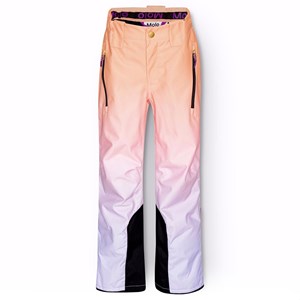 Wind- and waterproof trousers in recycled polyester in orange, pink, and purple gradient colours. The trousers have button and zip closure, an adjustable internal elastic, belt loops for Molos braces (additional accessory), and an adjustable leg opening with snow gaiters and extra reinforcement between the legs. The trousers have pockets and a large reflector at the back to increase visibility in traffic. Additionally, the trousers are lined with fleece in exposed areas and lined with 3M™ Thinsulate™ to provide greater mobility for the child.