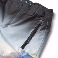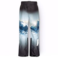 Wind- and waterproof trousers in recycled polyester with a print of snow-covered Alps with sun rays and a clear blue sky. The trousers have button and zip closure, an adjustable internal elastic, belt loops for Molos braces (additional accessory), and an adjustable leg opening with snow gaiters and extra reinforcement between the legs. The trousers have pockets and a large reflector at the back to increase visibility in traffic. Additionally, the trousers are lined with fleece in exposed areas and lined with 3M™ Thinsulate™ to provide greater mobility for the child.
