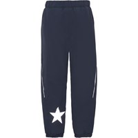 Paxton is a pair of Molo's new rain trousers in blue. Paxton is part of Molo’s Outdoor-Proof line that's made for active children. The trousers are perfect for moderately cold winter days. Paxton is windproof, waterproof and breathable and has taped seams. They have elastic waist, side pockets, adjustable leg openings with snow flaps. They have extra reinforcement at the inner legs. This product has a water-resistant, PFC-free surface treatment (Does not contain, e.g. PFOS, PFOA, etc). Water column pressure: 10.000 mm. Breathable: 8.000 g/m2/24hr.