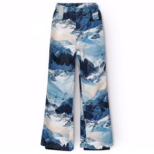 Wind- and waterproof snow pants made from recycled polyester with a winter landscape print in shades of blue. The snow pants have an elasticated waistband and an adjustable internal elastic, belt loops for Molos braces (extra accessory), and leg openings with snow gaiters. There is also a large reflector on the back to increase visibility in traffic.