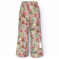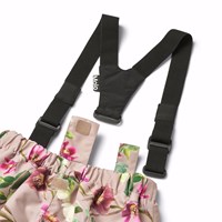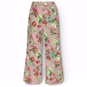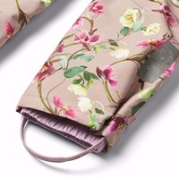Wind- and waterproof snow pants made from recycled polyester with a beautiful print of Christmas roses in white and pink shades. The roses branch out in their green leaves on a mocha-coloured background. The snow pants have an elasticated waistband and an adjustable internal elastic, belt loops for Molos braces (extra accessory), and leg openings with snow gaiters. There is also a large reflector on the back to increase visibility in traffic.