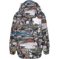 Waiton is a lightweight, functional rain jacket with a print of prehistoric animals in earth tones. It has a nylon lining. Waiton has a covered zipper to protect against wind and rain, taped seams and a detachable hood, two front pockets. The jacket has molo's iconic star relfectors on the back for increased visibility in the dark. This product has a water resistant, PFC-free surface treatment (Does not contain, e.g. PFOS, PFOA, etc). Water column pressure: 5.000 mm. breathable: 5.000 g/m2/24hr.